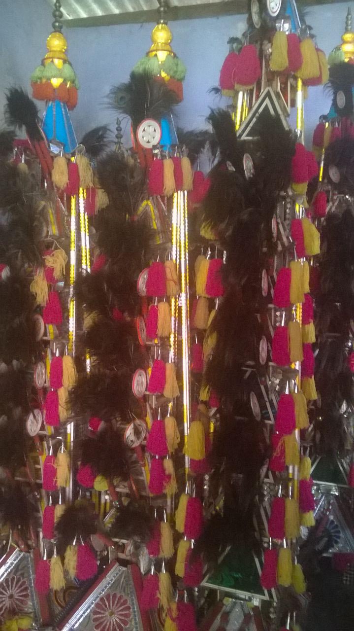 Kavadiyattam literally means dance carrying a kavadi. Kavadies are usually of different sizes and shapes, each with its own significance. Pookavadi is one decorated with brightly coloured artificial flowers, a mayilpeeli kavadi decorated using only peacock feathers and ambalakavadi, one shaped like the gopuram (tower) of a temple. A kavadi can rise up to a height of 10-18 feet.